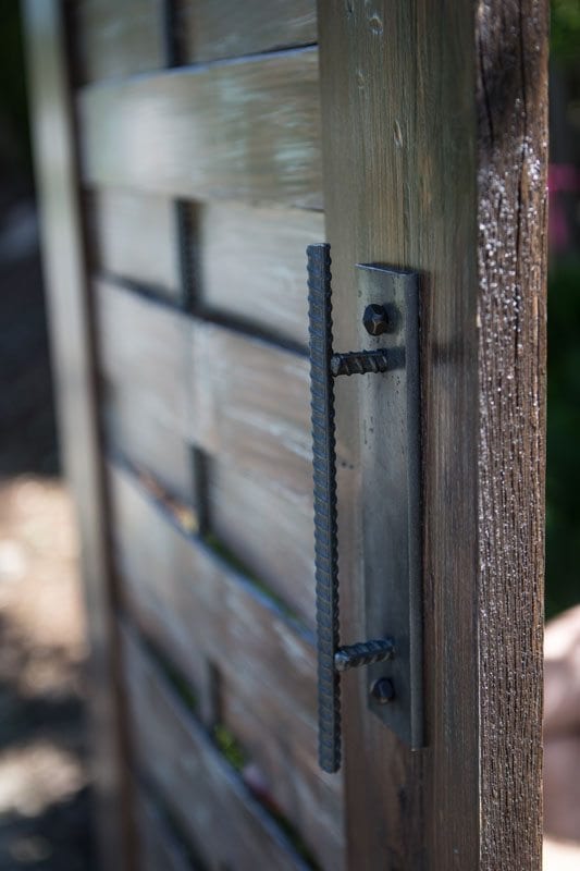 The Bohemian is a modern, industrial-style portal perfect for loft and commercial spaces. Constructed exclusively from recycled materials, it is made from slats of fir woven around steel rebar. The slats, which are tongue-in-grooved into a fir plank frame, are distressed with a hammer and dry brushed with three colors for an urban weathered look. Sporting a rebar handle and sealed with polyurethane, the back of this door is the same as the face.